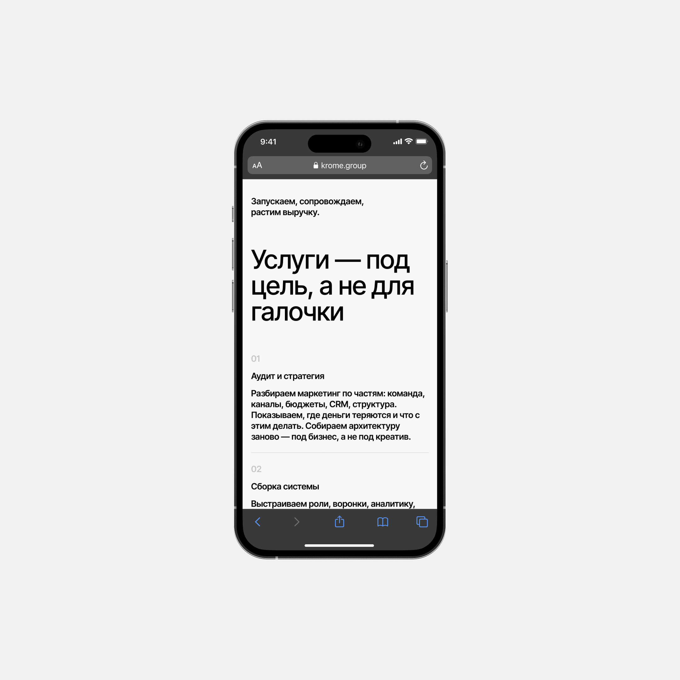 Сайт для команды Krome Group с фокусом на выразительную подачу, ясную структуру и живой характер бренда. Проект начался с концепта главной страницы, который нужно было развернуть в полноценную систему для сайта, сохранив энергию бренда и сделав интерфейс удобным для развития. Моя зона ответственности: развитие концепции, структура, паттерны и компоненты. Курировал дизайнеров и масштабировал визуальную систему. Собирал адаптивы, выстраивал сетки, стили и токены, вёл коммуникацию с заказчиком и защищал проектные решения. Проект получил Silver на Tagline Awards и попал в Short List фестиваля «Среда».