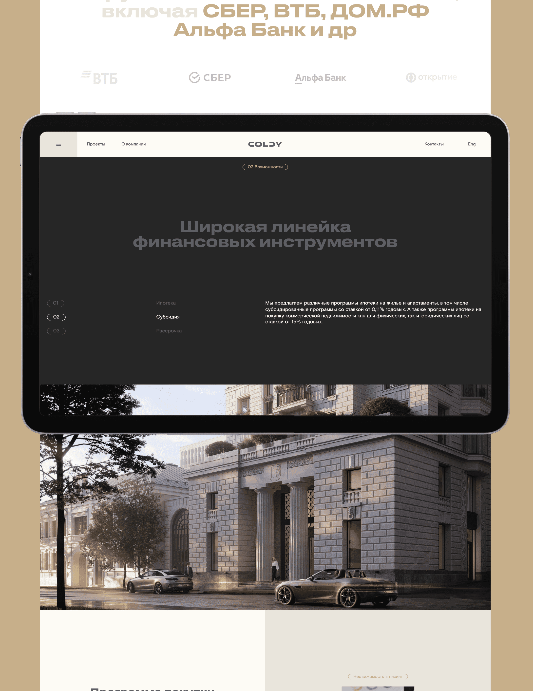 Сайт девелопера премиум-сегмента с фокусом на визуальное доверие, чистую структуру и аккуратную подачу бренда. Проект начался с концепта главной страницы, который нужно было развернуть в полноценную систему для всего сайта, сохранив характер бренда. Моя зона ответственности: структура, паттерны и компоненты. Я масштабировал визуальную систему, собирал адаптивы, выстраивал сетки, токены и стили. Работал в связке с дизайн-лидом, разработка была на стороне клиента. Проект получил бронзу на WOW Awards.
